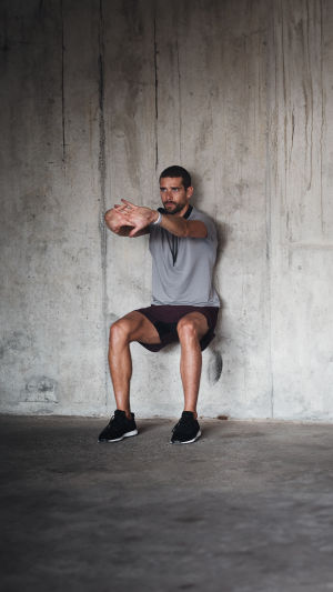 The wall squat is simple but precise. We start by standing with our back flat against a wall, as if we’re sitting on an invisible chair. Our thighs and calves form a 90-degree angle, and feet stay flat on the floor.